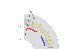 モータ効率を低下させ発熱の原因ともなる損失の主要因は駆動電流によって発生する導体部の銅損と駆動電圧に伴って生じるコア部の鉄損に大別されますが、アモルファス合金の導入により鉄損を大幅に低減することが出来ます。このため下記の効果が実現できます。