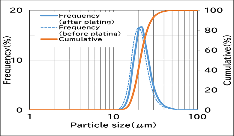 これらのめっきは、従来のNi-P微粒子の特長であった耐熱性、均一な粒径(図参照)、真球度は維持したままで施すため、接続面の平坦度維持と適切なギャップ(すきま)形成は従来のNi-P微粒子と同レベルで可能です。さらに、高い硬度を持つNi-P微粒子をコアとすることから、シリコン基板やガラス基板などと半導体チップの接合(実装)に役立つことが期待されます。