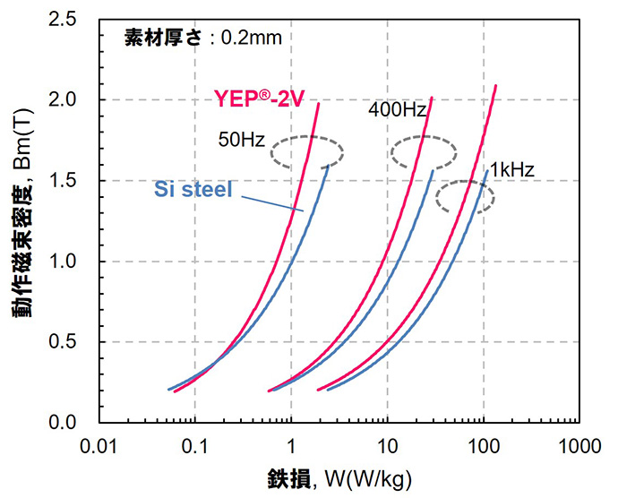 YEP®-2Vは、パーメンジュール(Permendur)と呼ばれる鉄(Fe)-コバルト(Co)合金の加工性をバナジウム(V)添加により改善したFe-Co-V合金です。