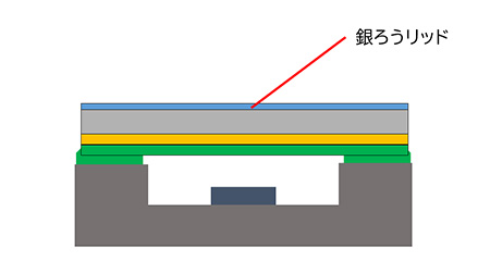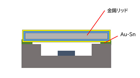 あらかじめ成形された低融点の金錫ろう材層を用いて、リフロー工程により封止するリッドです。低融点での封止が可能なため、高気密性が求められる高性能デバイスの製造に好適です。