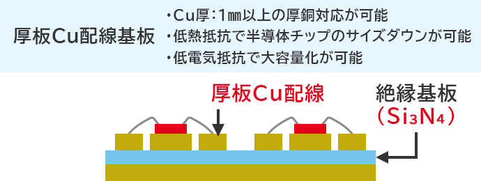高強度・高靱性のSi3N4セラミックスに高熱伝導性を付与することで耐熱衝撃性および耐熱疲労性を向上させ、半導体モジュールの信頼性を大幅に改善しました。また、従来材のアルミナおよび窒化アルミでは不可能な新規モジュール構造を実現しました。