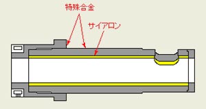 図2に構造の断面図を、図3に外観写真を示します。構造的には円筒形状であるスリーブを内層と外層の二層に分けて、内層をサイアロンの筒、外層を特殊合金の筒として組立構造としました。内筒のサイアロンには保温性、耐焼き付き性などスリーブの基本機能を持たせ、外筒の特殊合金には荷重などの外力からサイアロンを保護する役目を担わせています。内筒と外筒は焼バメにて一体に組み立てます。