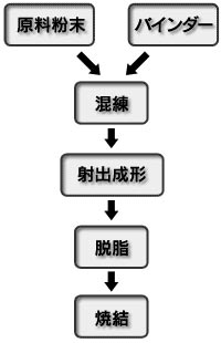 MIMの工程は、図1のフローチャートに示すように、三次元複雑形状品をニアネットシェイプで量産することに適した製法です。