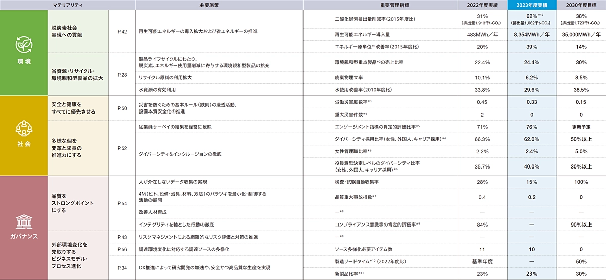 プロテリアルは環境・社会・ガバナンスで特定した6つのマテリアリティに対応する主要施策を設けるとともに、主要施策の進行状況を管理するための指標を各施策に設定しています。この重要管理指標の目標数値は2030年度を期限としており、目標の達成に向けて着実な施策の実施を推進していきます。