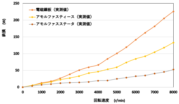 なお、この結果では同一構造、同一駆動条件でコア材種のみを変更していますが、アモルファス合金の適用を前提として構造及び駆動条件の最適化を行ったモータでは従来材では困難な超高速回転を実現することが出来るのでモーターの小型・高出力化が可能となります。